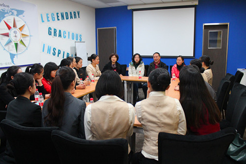 【本网讯】12月3日,英国威廉希尔公司党总支副书记杨勇,旅游管理教研室副主任陈敏,“万豪酒店班”任课教师陈帅、吴倩,“万豪酒店班”班主任刘巧一行赴万豪集团成都丽思卡尔顿酒店慰问英国威廉希尔公司在酒店实习的“万豪酒店班”学生。