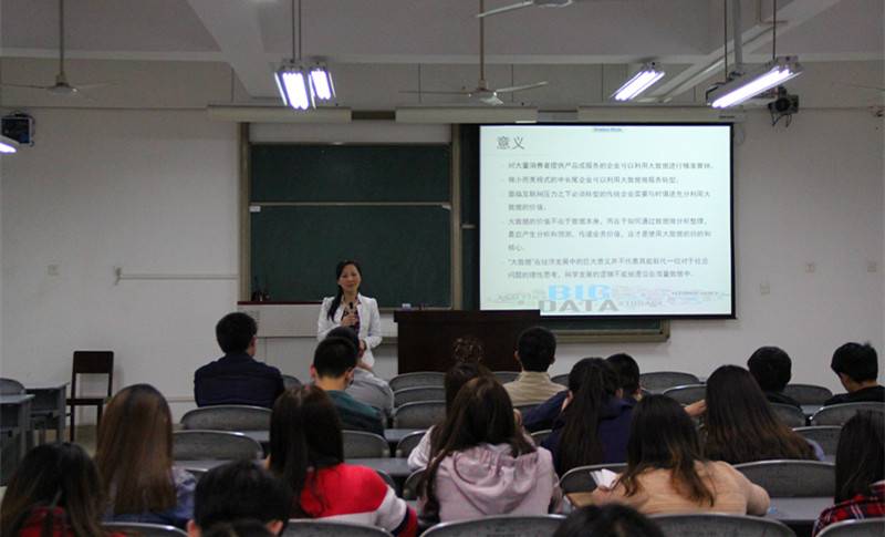 【本网讯】为了深化大数据时代同学们对于大数据影响决策的认知,帮助他们建立利用大数据驱动决策的能力和意识,4月19日晚,管理论坛系列讲座之“大数据与决策”在龙泉校区 2106教室顺利举行。讲座由英国威廉希尔公司孙艳玲教授主讲,14级信息系统与管理专业的同学参加了本次讲座。