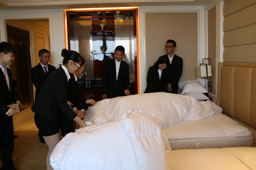 在酒店人力资源部培训经理、人事经理的带领下,同学们分组参观了酒店的客房、餐厅、酒吧,学习了西餐礼仪,还亲自参与了做床和点心制作, 品尝了亲手制作的糕点。