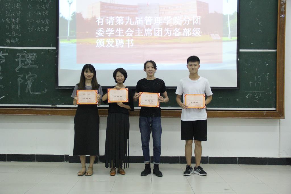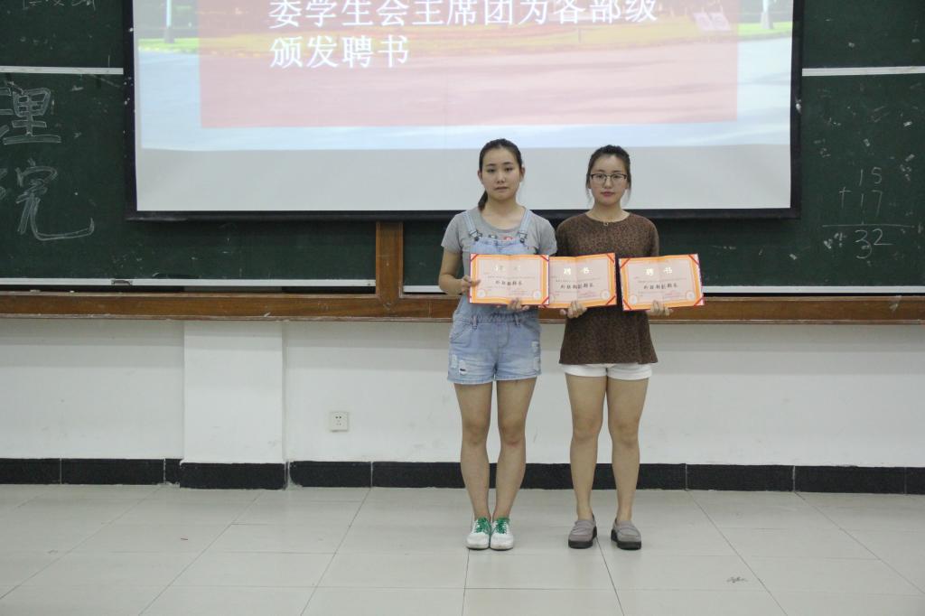 大会第三项,宣布新任分团委、学生会主席团和各部级成员名单,并给第九届全体主席团成员和各部级颁发任职聘书。