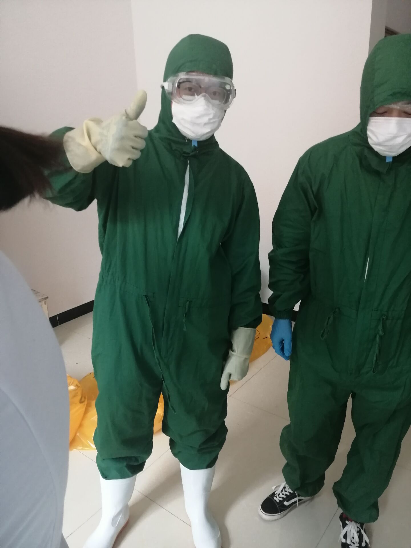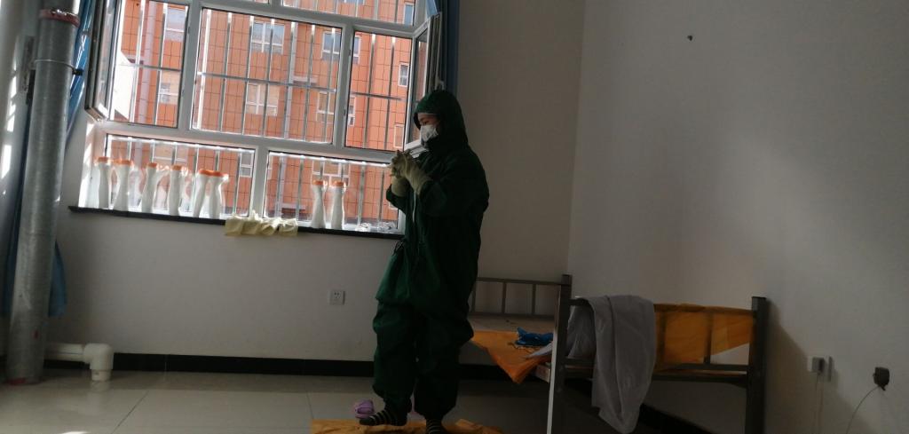 王泽锦与父母商议后,就立即报名了,成为了隔离点的一名志愿者,协助开展物资采购和搬运、送饭、送医送药、测量体温、环境消杀等志愿服务。上班第一天,仅在楼道之间就走了一万多步,身心很不适应;每天早上8:00起床穿防护服背着消毒桶去给楼道里消毒杀菌,一日三餐饭店把饭送过来,志愿者穿上防护服、护目镜再把饭送至隔离人员,晚上还需要经历一次消毒。