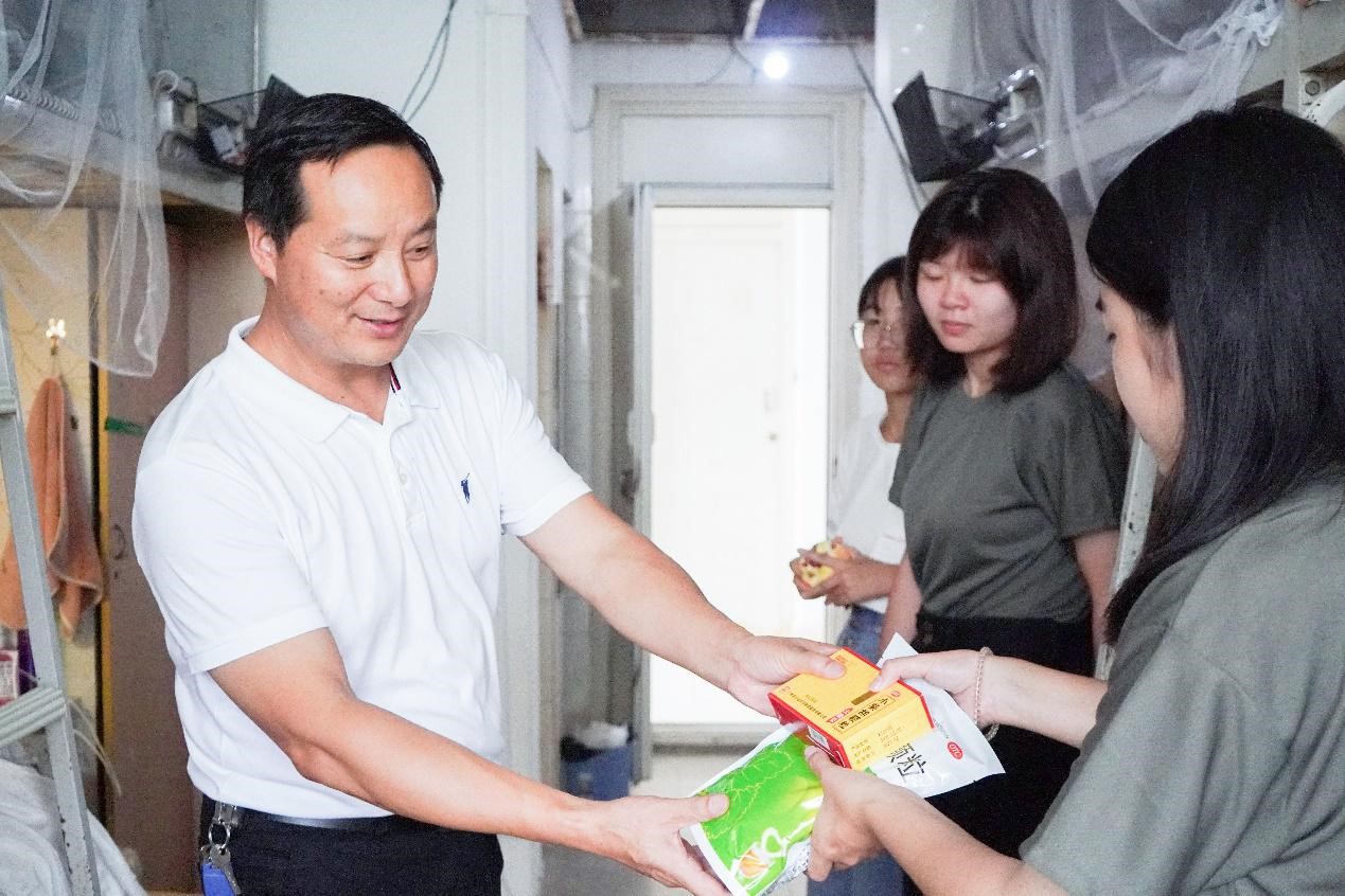 2021年9月14日上午,学院党委书记王子华带领新生辅导员深入新生寝室,旨在引导学生尽快适应大学生活,进入学习生活状态。同时,最近天气变冷,正值军训阶段,为预防新生感冒,学院特意为每位同学准备了感冒药品,一同送到新生手中,让同学们感受到学院的关怀,尽快融入大学,增强归属感。