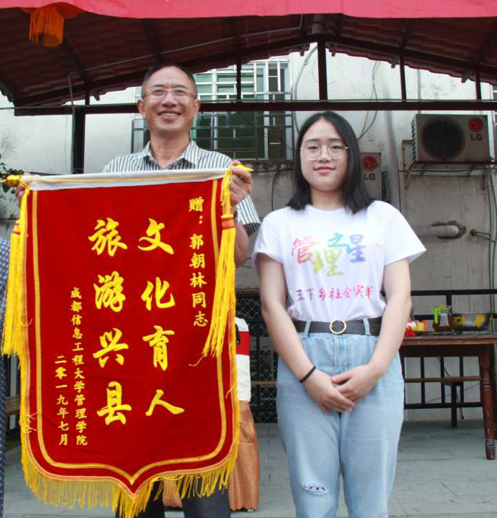 最后在热烈的掌声中郭朝林同志结束了其精彩的讲解,为感谢郭朝林同志,带队老师和同学们赠予郭朝林同志“文化育人,旅游兴县”的锦旗。通过这场详细的讲解后,同学们对汉源当地的人文历史、地理特征、特色农业有了较为基本的了解,希望接下来自己身体力行深入的感受当地的的风土人情。让我们一起期待和预祝明天的活动圆满成功!