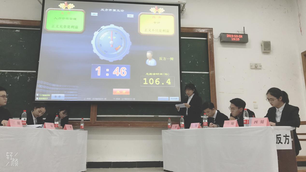 经过初赛和复赛两轮角逐,人力资源队及会计队从八支队伍中脱颖而出闯入决赛。辩论赛伊始,双方辩手依次入场做自我介绍,比赛主席介绍辩题及各方观点。在工作人员演示了辩论赛的提示音后,辩论赛进入立论陈词阶段。首先两方一辩分别就辩题发言,而后接受对方四辩盘问。在激烈的攻辩阶段,正反方二辩分别针对对方立论作驳论,接下来由正反方二辩对辩,最后由正反方三辩进行盘问和小结。第三个阶段是更为激烈精彩的自由辩论环节。双方辩友各执其词,据理力争,赛场上呈现出激战的氛围。最后进入结辩阶段,正反方四辩分别总结陈词,结束了本次辩论赛。