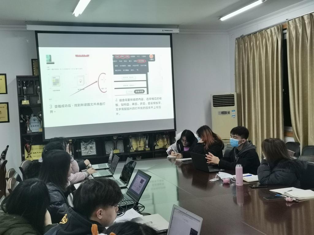 两个学院的团队成员在进行了自我介绍后,培训正式开始。周虹竹和赵姝琪同学分别从微信公众号的特点,创建微信公众号的步骤,公众号的运营,微信推文的实操四个方面进行了细致而丰富的讲解。在讲解过程中,同学们也积极的进行了讨论和交流。