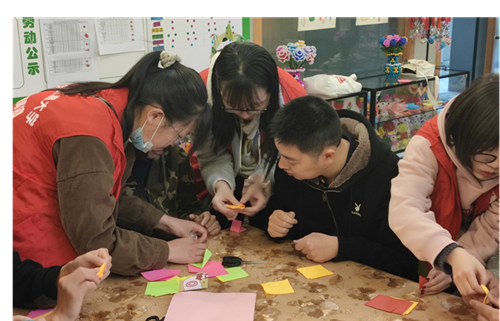 活动开始前,为了确保活动的顺利开展,志愿者们通过绘画展板进行校内宣传,鼓励和引导同学们参与活动。为了丰富活动的内容和形式,志愿者准备了丰富的节目和精彩的团队游戏。活动过程中,志愿者们演唱了《平凡之路》、《夜空中最亮的星》两首歌曲,阳光家园的学员带来了精彩的手语舞表演。表演结束后,志愿者与阳光家园学员共同制作了精美的纸花。活动结束后,志愿者代表向阳光家园赠送了慰问物资,阳光家园学员们也向志愿者们表达了感谢。