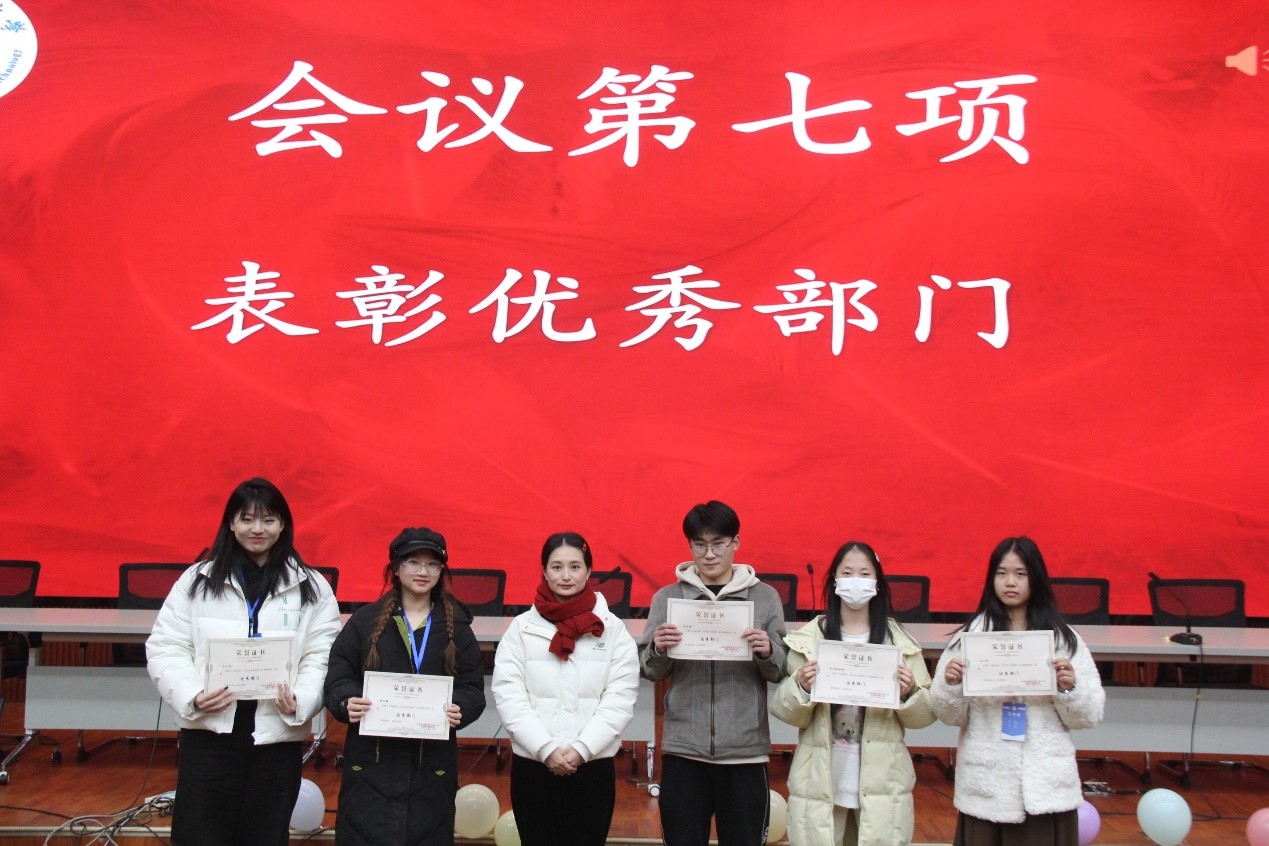 紧接着,便是表彰环节。大会表彰了徐涛、李颜颜等30名优秀志愿者,付月、杨伊琳等15名优秀负责人,潘建权、唐亮等5名先进个人以及组织部等5个优秀部门。在过去的一学期里,志愿者们积极参与并服务于学院的各项活动,用实际行动彰显了奉献、友爱、互助、进步的工作精神。负责人们充分发挥了自己的工作特长和组织能力,为团委学生会的各项工作奉献了自己的力量。此次表彰不仅是对他们本学期工作的肯定,更激励着全体学生会成员砥砺奋进、不断向前。