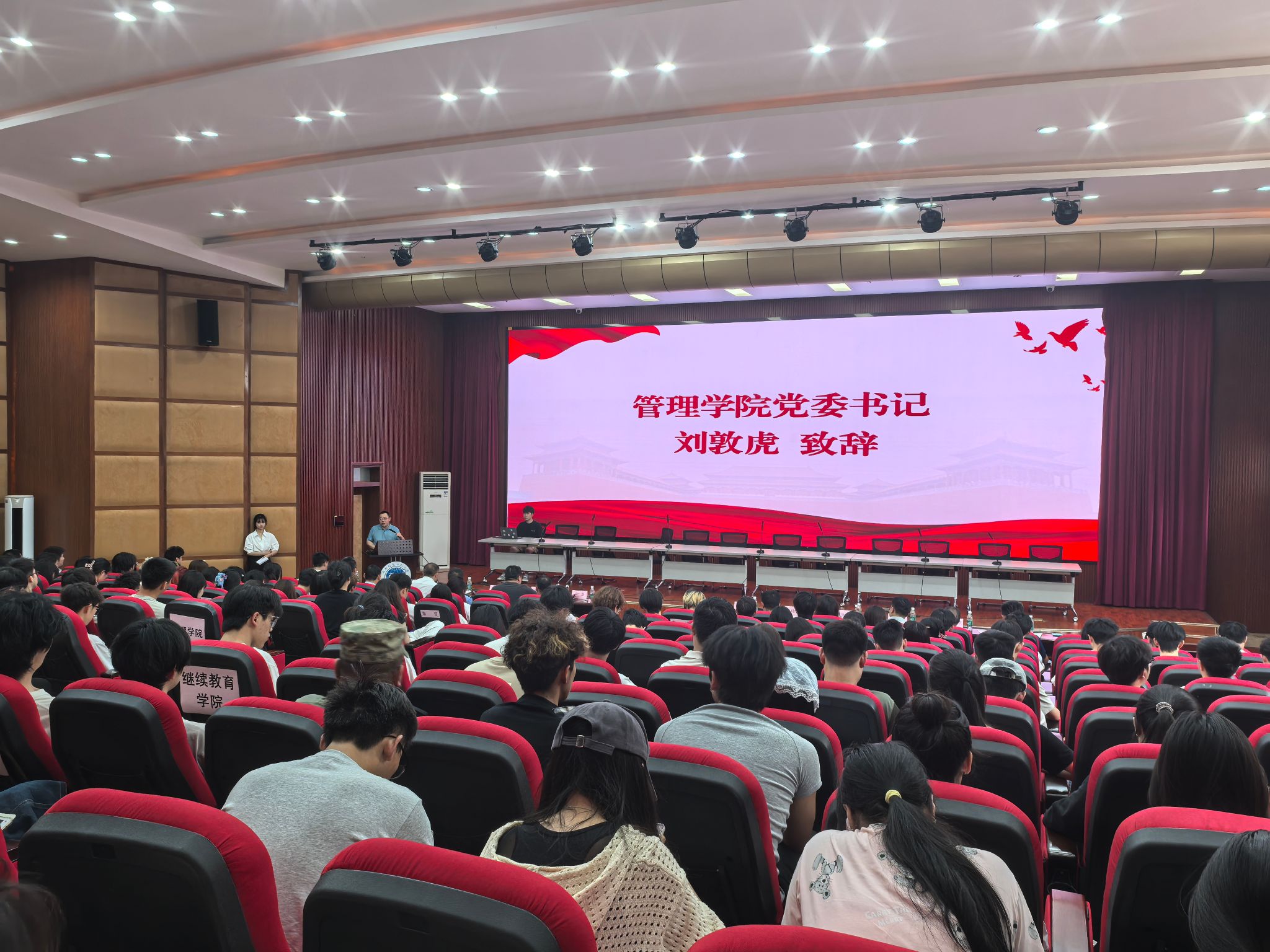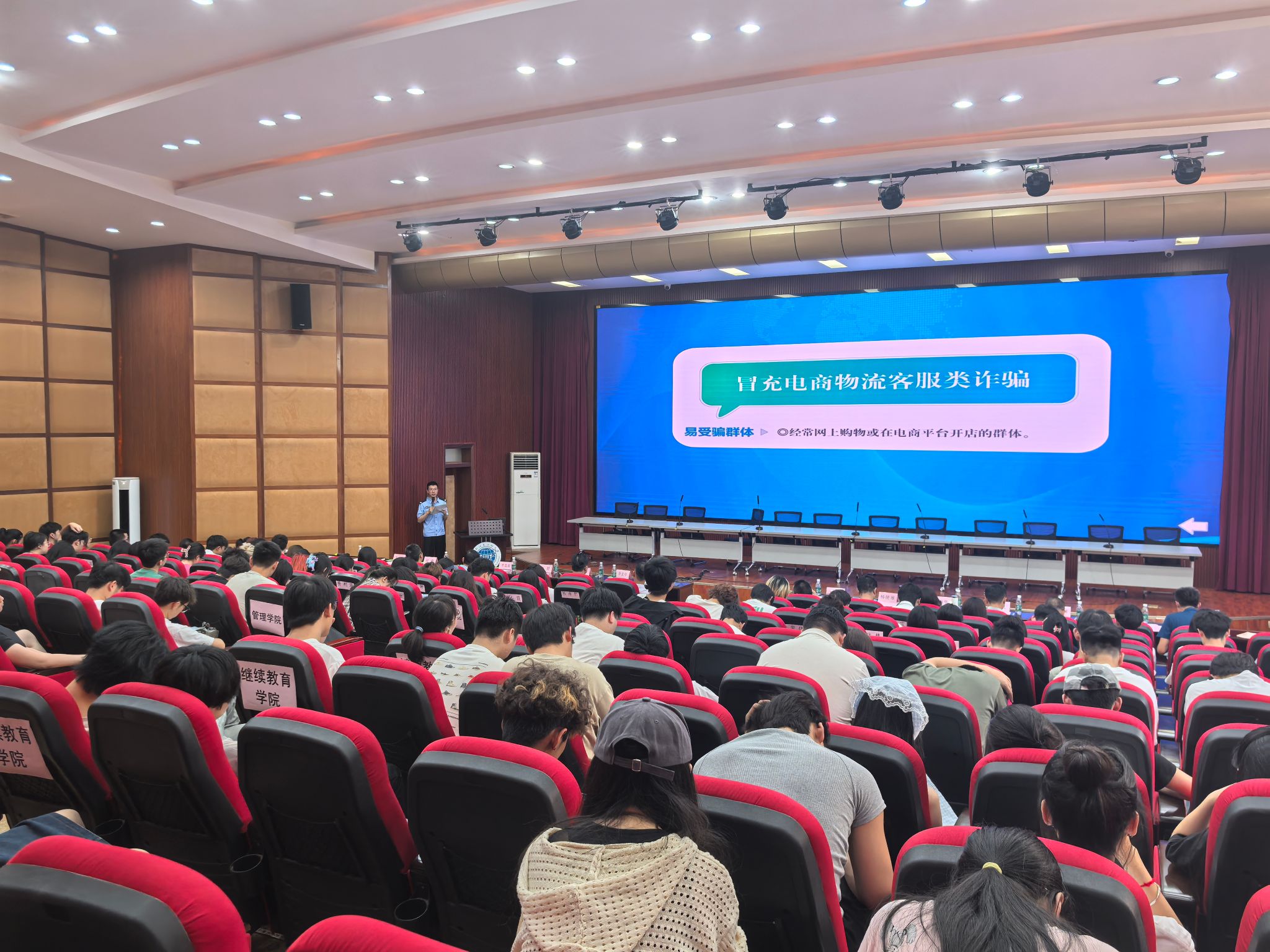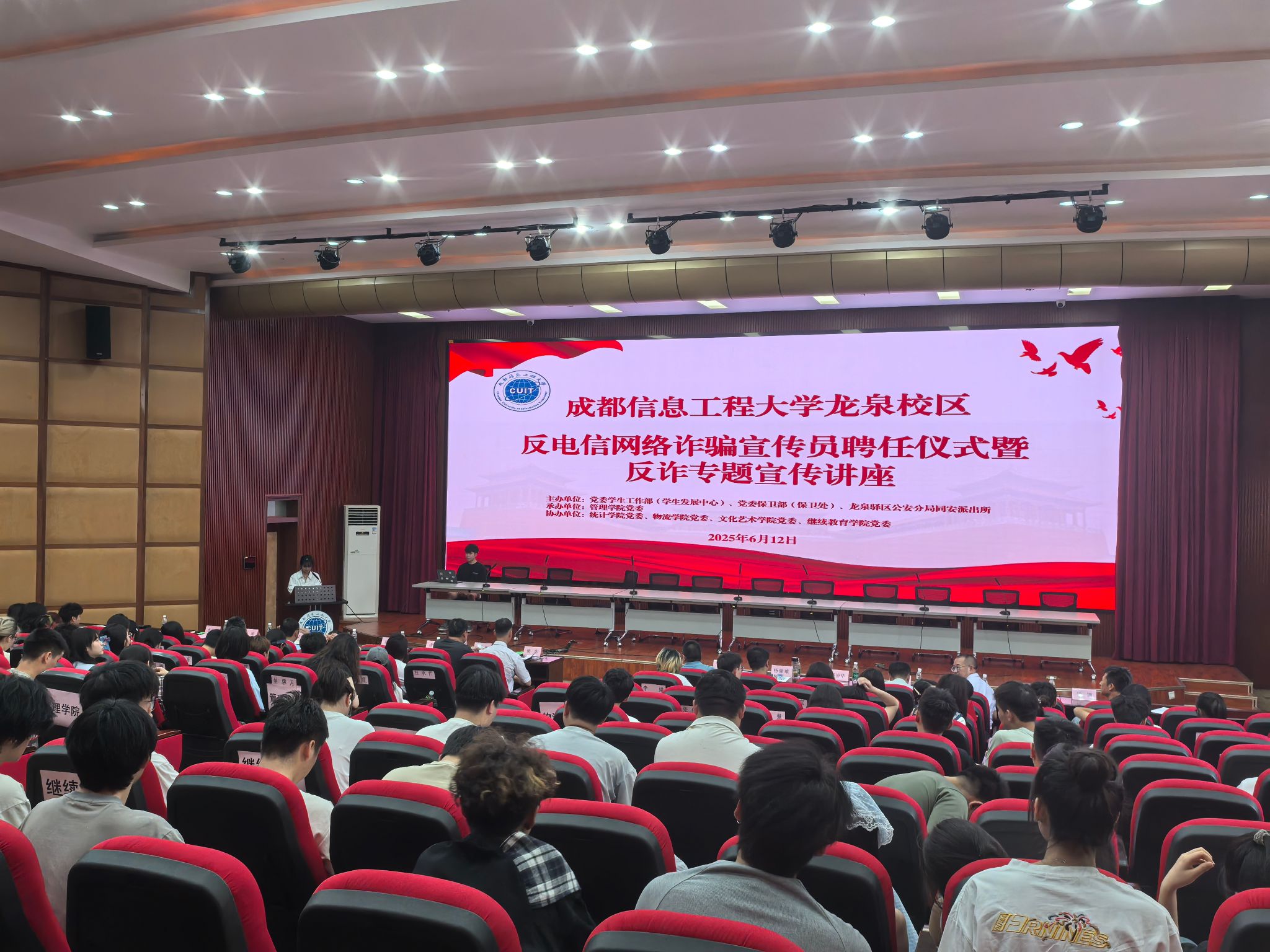 6月12日下午,由学校党委学生工作部、党委保卫部、龙泉驿区公安分局同安派出所主办,英国威廉希尔公司党委承办,龙泉校区其他学院党委协办的反电信网络诈骗宣传员聘任仪式暨反诈专题宣传讲座,在龙泉校区三教二楼学术报告厅举行。龙泉驿区公安分局刑警大队唐杰警官、同安派出所所长赵胜等嘉宾,学校党委学生工作部副部长梁念、党委保卫部副部长李文华、英国威廉希尔公司党委书记刘敦虎、以及各学院学生科科长、教师代表参加,吸引了龙泉校区270余名学生。