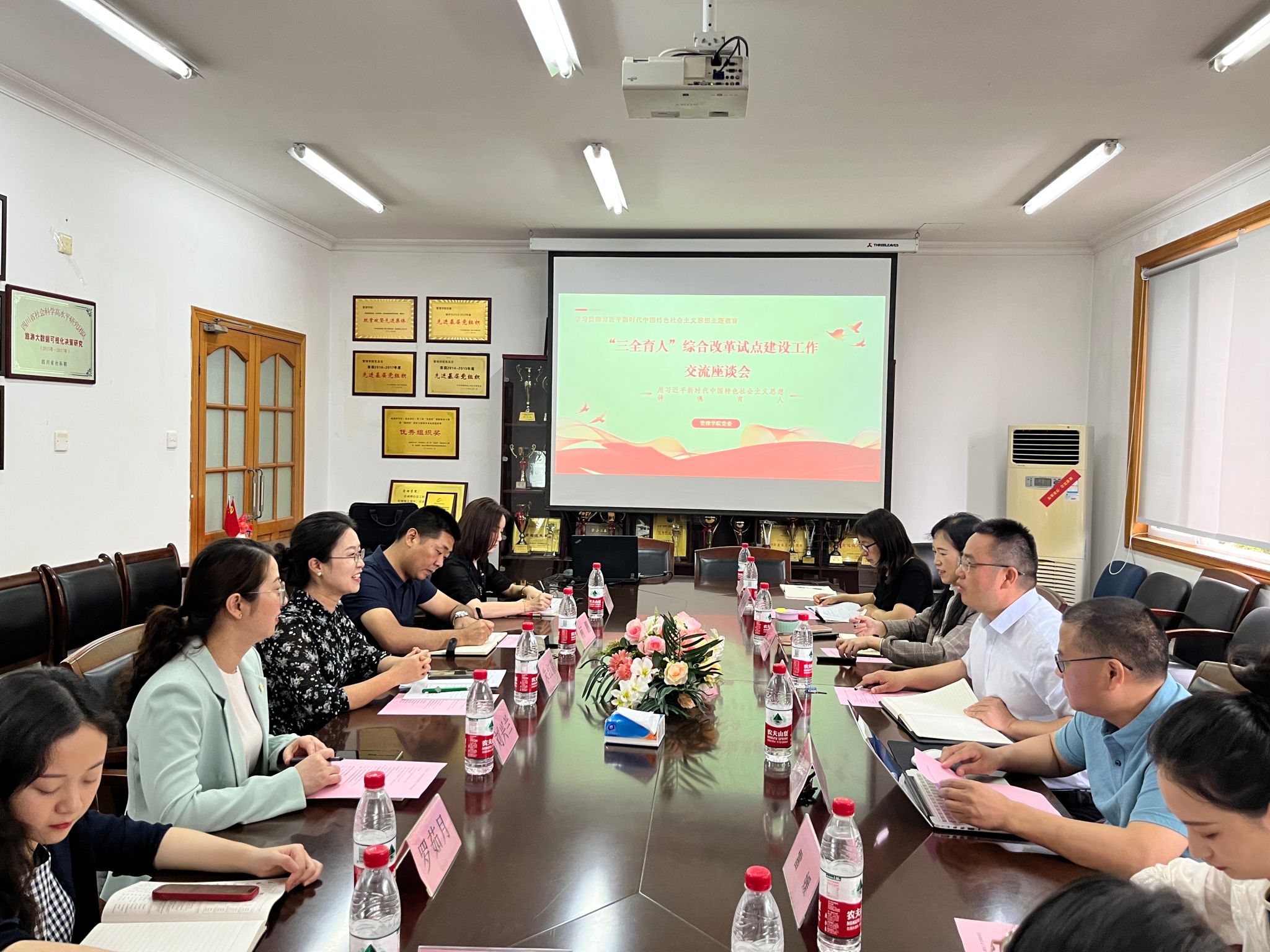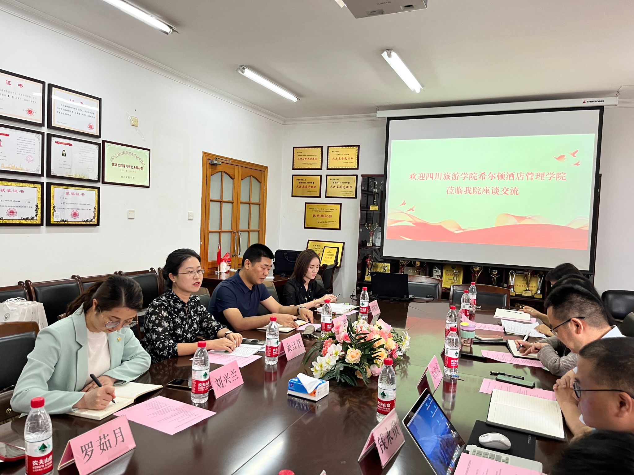 为深入学习贯彻习近平新时代中国特色社会主义思想主题教育,坚持以习近平新时代中国特色社会主义思想铸魂育人,总结交流经验,凝聚思想共识,推动“三全育人”综合改革持续深入开展,6月16日上午,四川旅游学院希尔顿酒店英国威廉希尔公司党委书记朱红萱带队到我院交流“三全育人”综合改革试点建设工作,学院党委书记刘敦虎、党委副书记刘宇、旅游管理与市场营销系主任钱永贵及辅导员代表参加了交流座谈。