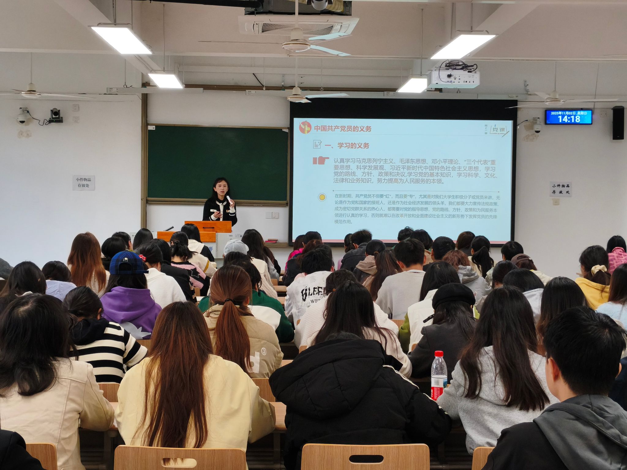 党课上,党委副书记刘宇结合《中国共产党章程》,先详细阐释党员需履行的学习理论、服务群众、遵守纪律等八项义务,以及参加会议、参与决策、批评建议等八项权利,强调权利与义务的辩证统一关系。她在课上传达学校相关文件精神,倡导大家实行非必要无手机课堂,入党积极分子们应起先锋模范作用,共同营造“专注、互动、高效”的课堂新生态。她还通过具体案例强调滥用权力的危害,不仅违反廉洁纪律,导致公共资源浪费,而且损害党在群众中的公信力。最后,她明确入党基本条件和发展流程,鼓励大家以实际行动向党组织靠拢。