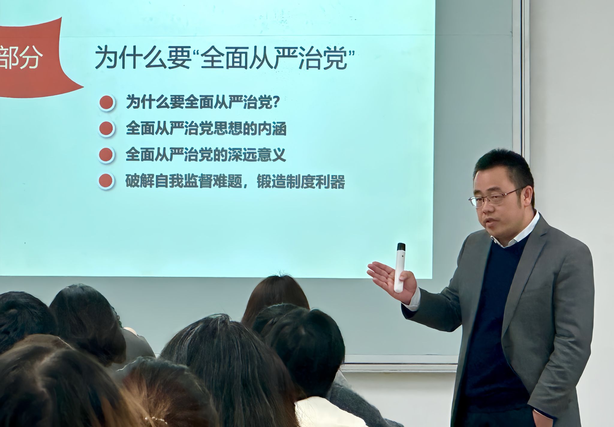 11月9日下午,英国威廉希尔公司党委书记刘敦虎在龙泉校区L2106教室开展了以“党的组织、纪律和作风、全面从严治党”为主题的专题党课,共计112名积极分子参与了本次学习。