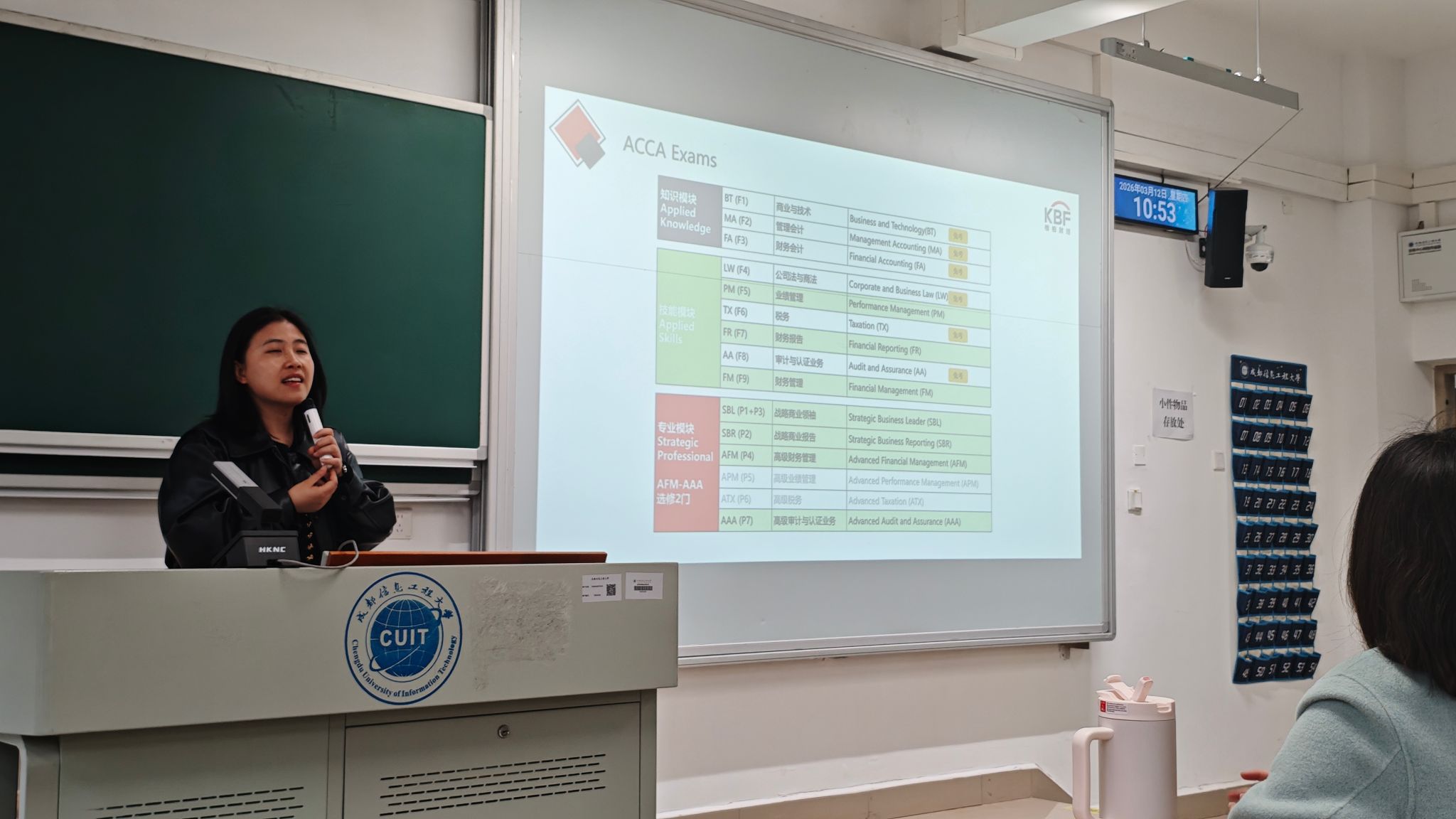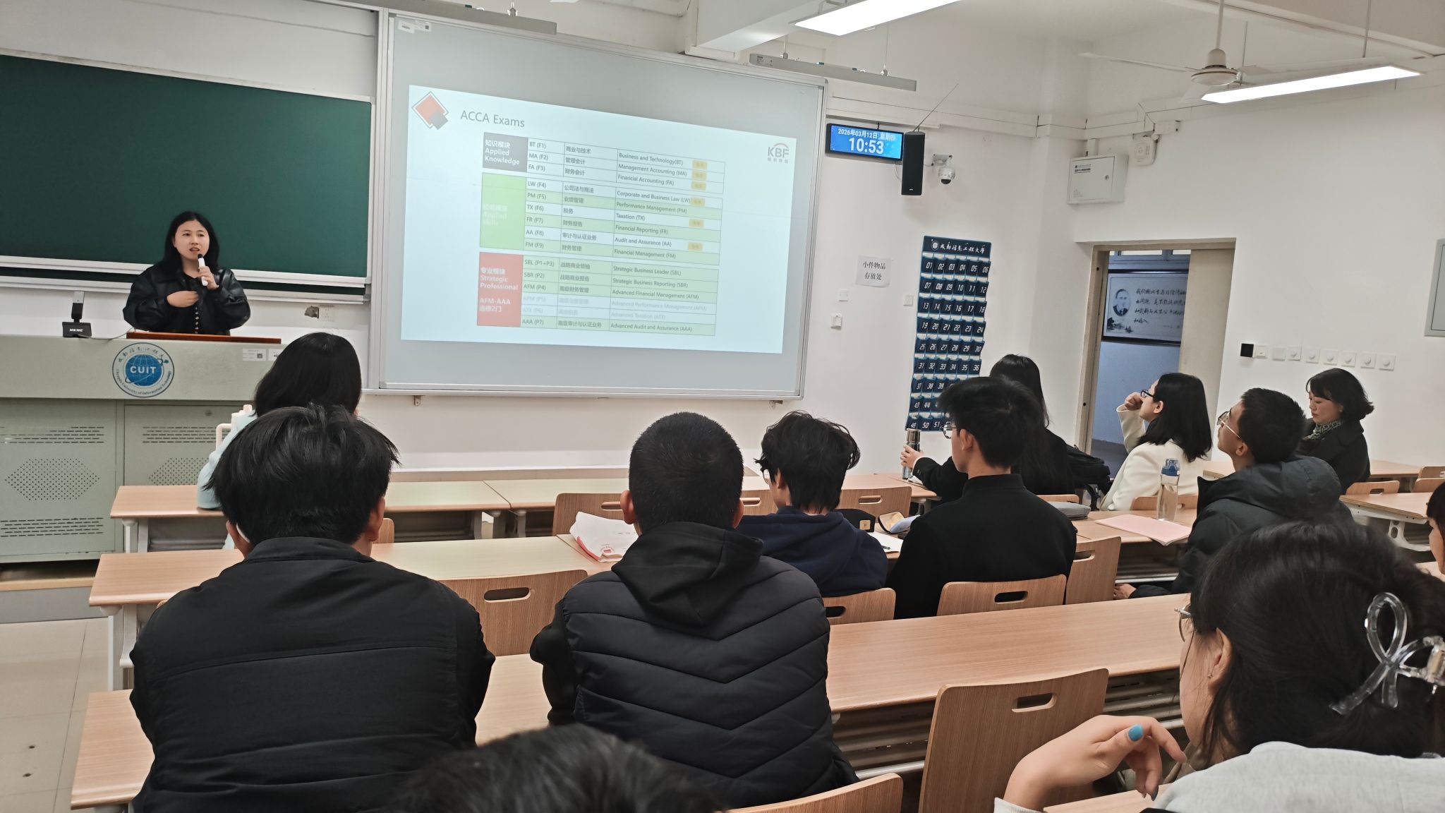 蒋维针对ACCA专业课程学习与备考,细致解读了核心入门课程的学习方法,并为英语基础薄弱的同学提供了实用建议,详细介绍了ACCA部分科目的备考要点、优质资源及奖学金政策,为同学们的证书攻坚之路提供了清晰导航。徐超男以“2026 ACCA全国就业力X未来商业创想大赛”(JHC)赛事为例,鼓励同学们在竞赛中拓宽视野、链接优质机会。