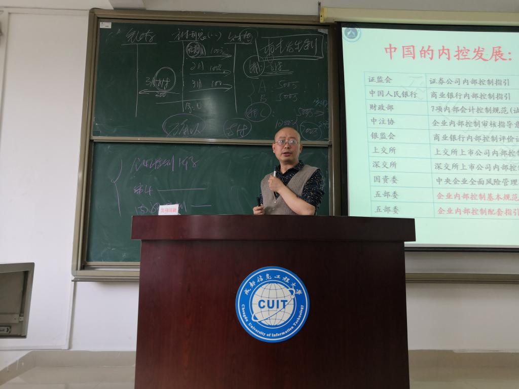 专题讲座伊始,陈教授先为学生介绍内控三大体系,即会计准则体系、审计准则体系、内部控制体系,并系统阐述了三大体系的关系。随即,陈教授简单介绍内部控制的产生与发展经历的阶段,引出不相容的四个职务,举例形象贴切,通俗易懂,同学们积极发言,师生互动性强,课堂气氛活跃。为使同学们更好理解内部牵制,陈教授举例企业采购流程,逐步分析,引入内部牵制的责任分工,充分论证内部控制分工相互弥补、相互牵制的重要作用。最后,陈教授再次为同学们阐述内部控制的含义及作用,同学们印象深刻。