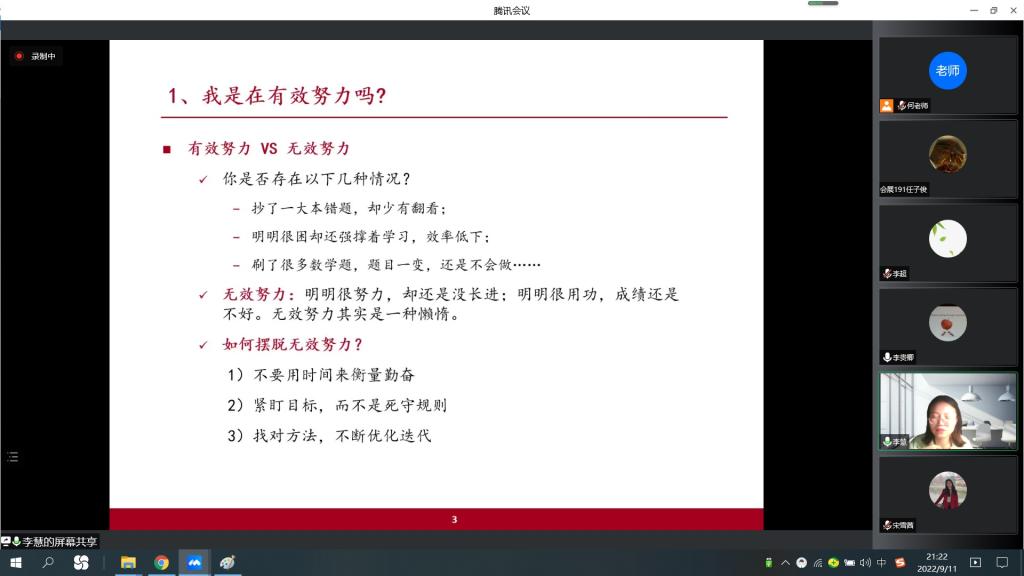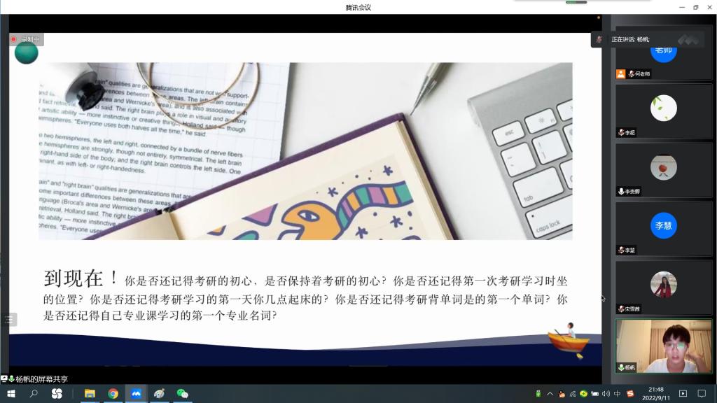 随后,往届优秀毕业生作考研经验分享。2019届毕业生李慧以优异成绩考上中国人民大学。她从“我在有效努力吗?”、“我能坚持到最后吗?”等角度,对考研准备、初试、复试环节进行了分享,鼓励大家不言放弃。跨专业考入本校研究生的2017届毕业生李超分享了考研专业的选择。2021届毕业生杨帆、刘向前结合自己的经验告诉备考同学,要早定目标、早有行动、积累知识,做好考前真题练习,找对学习方法。分享结束,备考同学和老师、学长学姐们进行了互动问答。