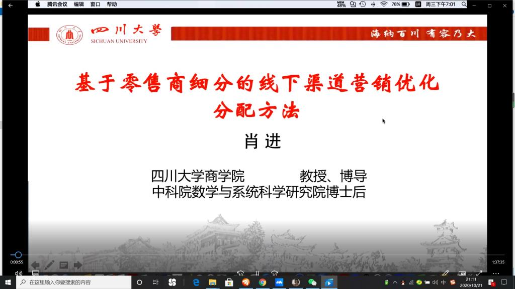 讲座以肖进在营销实际问题研究为主线,主要围绕线下营销层级体系、营销资源的作用、营销资源优化分配模型、模型计算方法等几个方面,深入的讲解了当前营销资源与营销体系的结合优化。肖进教授以自身研讨经验为例,研究发展过程为主,从研究主题的确立与作用、研究方法模型的尝试与分析、营销资源的优化分配与配置模型的计算四个方面,系统讲解了多个资源最优化配置的思想与方法,肖进的研究给大家提供了新思路,用创新的方法去解决企业出现的问题,给同学们的问题研究、选择与分析建模良好启迪,对如何利用理论解决实际解决问题作出了示范。