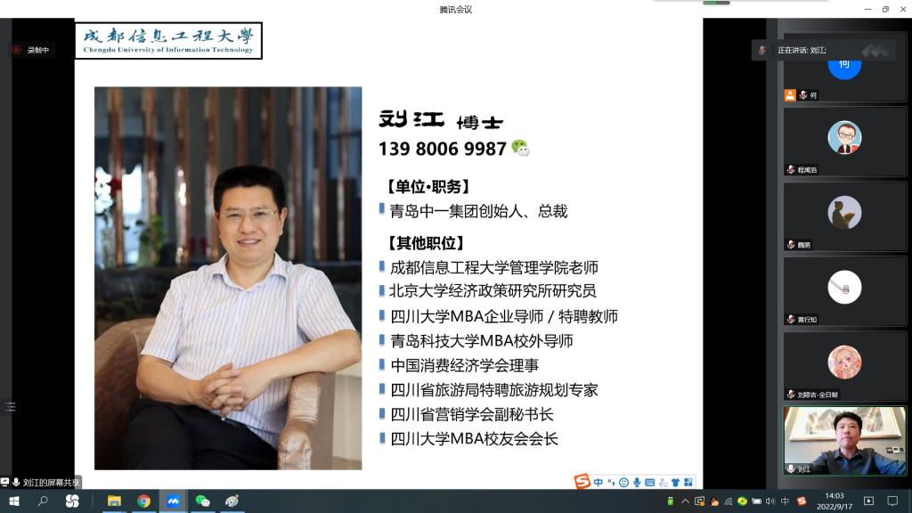 9月17日星期六下午,青岛中一集团创始人、总裁、北京大学经济政策研究所研究员、四川大学MBA企业导师/特聘教师、青岛科技大学MBA校外导师、中国消费经济学会理事、四川省旅游局特聘旅游规划专家刘江博士就“企业经营者管理—基于农业企业经营管理的思考”在线上为我院2022级管理科学与工程、农业管理专业的研究生们进行了专题讲座。